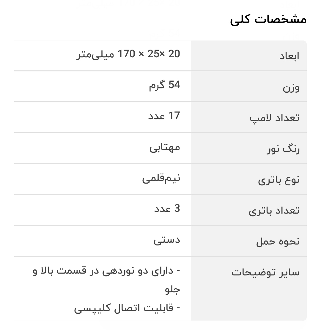 در کل یک چراغ قوه کوچک و چند کاره با نور عالی که با سه عدد باتری نیم قلمی کار میکند و دارای نور بغل و جلو و همچنین مگنت کف و کلیپس از بغل میباشد و برای شرایط فعلی به شدت توصیه میشود 🙂